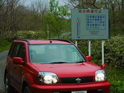 水没道道732号 上猿払浅茅野線 その3お知らせ今回紹介する道は、猿払村上猿払から浅茅野間を結ぶ道道732号である。その1へ その2へ カーブミラーが2つあるカーブを曲がり(28)、ムメイ川の日暮橋を渡る(29)。案内板がなければ、ここに橋があるのは判らない。写真の道路脇の右側の白いも水位標で、このムメイ川が氾濫するということなのかな?。 (29)の左カーブを曲がったところに、浅茅野側から見る冠水時通行止の案内板(その2で示したのと同型)がある。(30、車の丁度真ん中上の白いのが水位標)