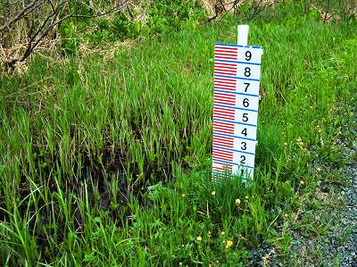 水深標の周りを見ると、道路横がすぐ湿地で、まだ草が大きくなっていないので水面が判る(33)。
