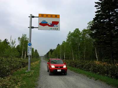 道なりに進むと、長いダートの直線路となる。そこには、上猿払側で見たのと同じ冠水注意の警告板がある(37)。