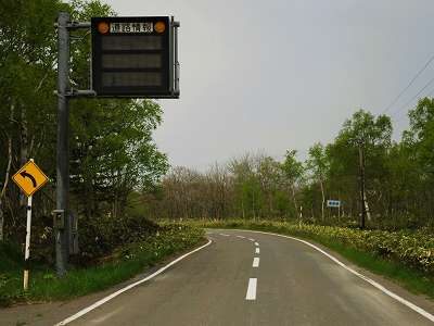 この辺りから道幅は完全2車線分となる。ムメイ川を古川橋で渡るが(39)、古川橋は橋の前後が橋の高さと同じである。 猿払一号線川を堀川橋で渡ると、その先は舗装路となる(40)。 (40)の右カーブを曲がったところに電光掲示板(点灯していない、41の道路上の黒いところ)、その先に旧来の道路情報板がある(41)。