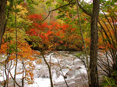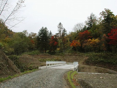 紅葉を見ながらの林道ドライブとなる(12)。標高が上がるにつれ、パンケニコロ川を渡る回数も増えていき、川もきれいである(13)。 14キロ地点にある櫟橋で、最近橋が流されたらしく架け替えたばかりの橋であった。この橋の手前の砂利も新しいので、引締っていないのでこの林道で一番滑る(14)。